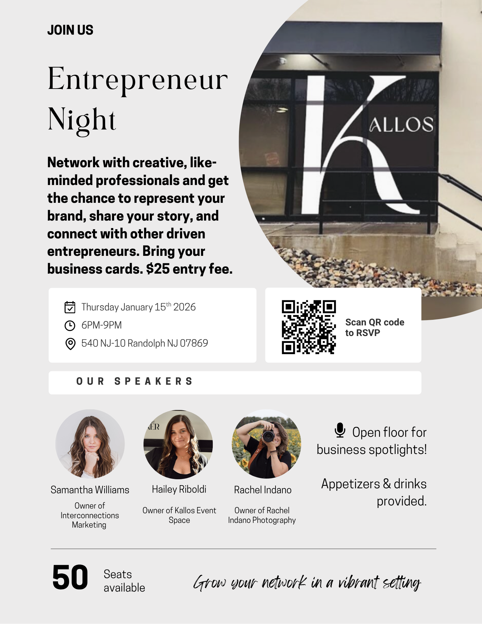 Entrepreneur Night Thursday, January 15, 2026 6:00 PM 9:00 PM Google Calendar ICS Join us to network with creative, like-minded professionals and get the chance to represent your brand, share your story, and connect with other driven entrepreneurs. Bring your business cards!